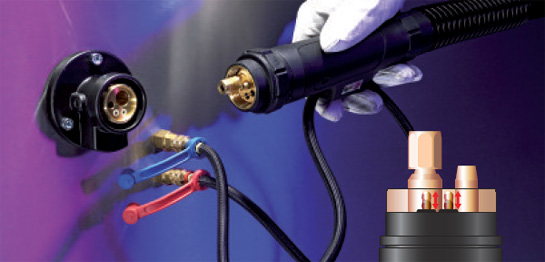 Центральний штекер із пружинними контактами WZ-2 ABICOR BINZEL для зварювальних пальників MIG/MAG з рідинним охолодженням забезпечує м'який контакт, навіть якщо контакти злегка пошкоджені через жорсткі умови експлуатації або деформовані через неправильну експлуатацію.